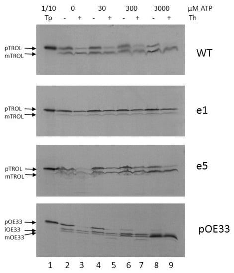 Experiments using increasing external ATP concentrations indicate that TROL requires more than 300 mM ATP for completion of its import into thylakoids, while only 30 mM is necessary for IM incorporation, as visible after thermolysin treatment (Figure 3). This result implies the stop-transfer mechanism of TROL import and its lateral insertion to the IM [11,22]. Time-scale experiments in the presence of 3 mM ATP indicate that the incorporation of TROL into the IM happens very early, and the smaller thylakoid form starts to appear after 2–5 min of import, reaching a maximum between 10–20 min (Figure 4). We observed that after addition of 3 mM ATP in wt, but also in e1, to some extent, there is much less of the IM form of TROL compared to the 300 mM experiment. The distribution of TROL between these two membranes might be influenced by the energy distribution between thylakoids and envelope compartments. TROL could be switching the intensity of its action between the IM (role unknown) and the thylakoids (regulation of photosynthetic electron transfer), influenced/directed by the energetic state of those compartments.