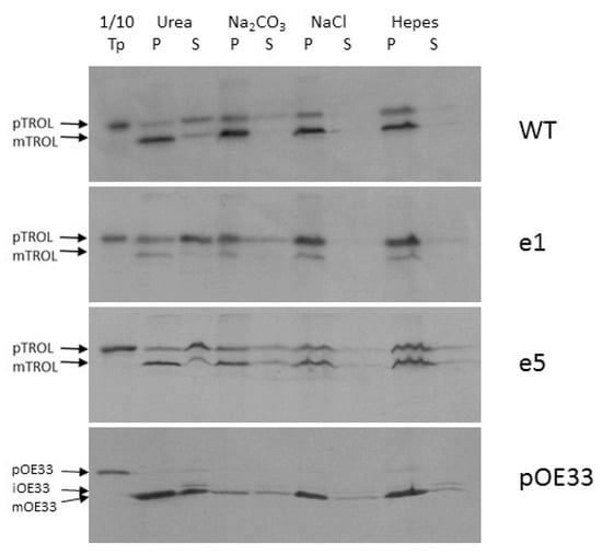 Jurić et al. [1] have shown that imported TROL could not be extracted from membranes by high salt, urea, or high pH treatments, indicating that At4g01050 is an integral thylakoid membrane protein. The same extraction procedures were used to investigate the membrane incorporation character of the e1–e6 TROL mutants (Figure 5). Only 6 M urea extracted a portion of protein, mainly the IM incorporated one, while TROL in the thylakoids remained fully protected. Mutation e1 causes visible changes in TROL localization, directing most of the protein to the IM of chloroplasts. Once there, the incorporated TROL resists the extraction procedures in the same way as the wild type protein, in which only urea solubilized a portion of the protein from the membranes. After import, the e5 mutation exhibits slightly more IM portion of TROL than the wt, but not significant enough to use it in further experiments.