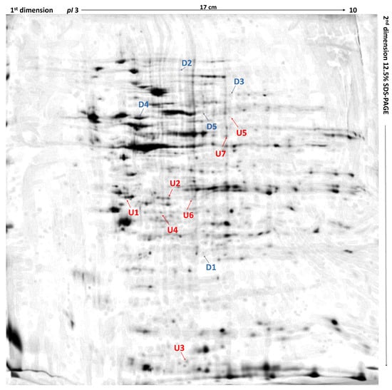 After first-dimensional separation with 12 h of gel rehydration and isoelectric focussing for a total 60 kVh at 20 °C with a current limit of 50 µA per strip (Hoefer IEF100, Hoefer, Inc., Holliston, MA, USA), the second dimension IPG strips were equilibrated according to a procedure described by Klose et al. [], using an addition of dithiothreitol (2%) and iodoacetamide (2.5%), respectively, for 15 min each. Two-dimensional electrophoretic separation was conducted using 12.5% polyacrylamide gel in BIO-RAD PROTEAN II xi Cell (Bio-Rad, Warsaw, Poland). Vertical separation was performed with 600 V/30 mA/30 W in 0.025 M Tris/glycine pH 8.3 buffer. After electrophoretic separation, proteins were silver-stained, scanned using the Image Scanner III (GE Healthcare, Warsaw, Poland), and processed by Delta2D software (version 4.7, DECODON, Greifswald, Germany) []. Statistical analyses were performed to select spots for further proteomic analyses, after manually excluding false-positive and false-negative spots.