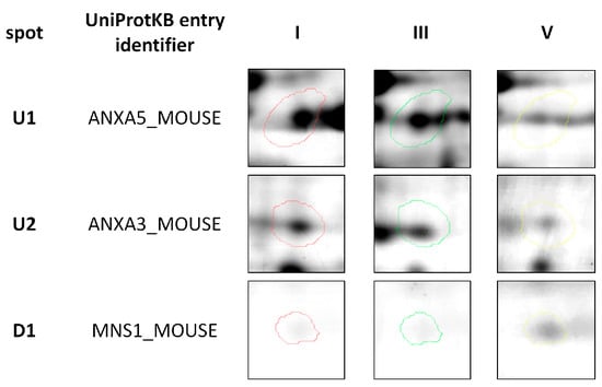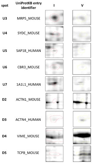 Stained gels were scanned using the Image Scanner III (GE Healthcare, Warsaw, Poland), and processed by Delta2D software (version 4.7; DECODON; Greifswald, Germany). Images were warped—spots of the same protein had the same position across all of the gels in the project—and fused. A fused image responds to the proteome map containing every protein spot obtained in the whole experiment. False positive and false negative spots were manually excluded. To find the expression ratios (quotient of the group means of relative spot volumes), a quantitation table was generated, and statistics were made over normalised volumes. To find the expression ratios (quotient of the group means of relative spot volumes), a quantitation table was generated, and the statistic over normalised volume was made. In this experiment, the mean volume of a given spot in group V was the denominator of the ratio parameter.