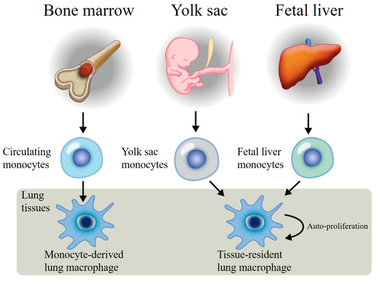 Monocyte-derived lung macrophages originating from bone marrow pluripotential stem cells, released into the circulating blood, and recruited into the lung tissues. These macrophages have limited proliferation functions. Tissue-resident lung macrophages are generated from both the yolk sac and fetal liver, recruited into the lungs during the early stage of lung development, and become resident lung macrophages with auto-proliferation functions.