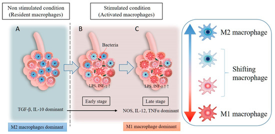 Resident macrophages are mainly of the M2 phenotype (M2 dominant) under non-stimulated conditions and secrete anti-inflammatory cytokines (TGF-β, IL-10) (A). An inflammatory stimulus in the lungs, such as exposure to pathogens, LPS, particulate matter, or INF-γ, leads to the phenotype switching of resident macrophages from M2 to M1 (B). In addition, circulating monocytes will be recruited into the lung tissues and activated by the inflammatory stimulus, with the majority of the macrophages in the inflammatory zone being M1 macrophages (M1 dominant). These M1 macrophages secrete inflammatory cytokines, such as NOS, IL-12, and TNF-α (C).