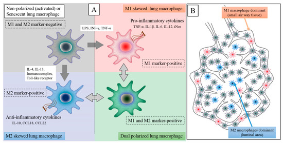 Patients with COPD have at least four types of macrophages in their lung tissues. Non-polarized or senescent macrophages are M1 and M2 marker-negative and secrete low levels of inflammatory and anti-inflammatory cytokines (left upper). Upon stimulation by Th1 cytokines (e.g., LPS and/or INF-γ), these cell become polarized to predominantly M1 lung macrophages and secrete high levels of pro-inflammatory cytokines (right upper). However, when non-polarized macrophages are stimulated by Th2 cytokines (e.g., IL-4 and/or IL-13), they become polarized to predominantly M2 lung macrophages and secrete high levels of level anti-inflammatory cytokines (left lower). COPD lung tissues also contain a large population of dual-positive macrophages (M1 and M2 marker-positive) (right lower). Nonetheless, the functional properties of dual-positive macrophages are still unclear (A). In COPD lung tissues, M1 macrophages are predominantly found in small airway wall tissues and M2 macrophages in airspaces while abundant non-polarized macrophages are present in both compartments. The distribution of dual-positive macrophages is still unclear (B).