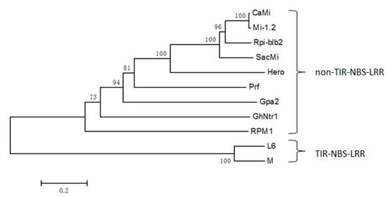 - Milligan, S.B.; Bodeau, J.; Yaghoobi, J.; Kaloshian, I.; Zabel, P.; Williamson, V.M. The root knot nematode resistance gene Mi from tomato is a member of the leucine zipper, nucleotide binding, leucine-rich repeat family of plant genes. Plant Cell 1998, 10, 1307–1319. [Google Scholar] [CrossRef] [PubMed]