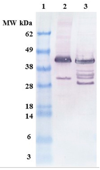 Figure 1. Anti-FLAG western blots showing N-terminal fragments of osteopontin (OPN). Lane 1. Molecular weight (MW) marker, lane 2. C. reinhardtii lysate diluted 4×, lane 3. E. coli lysate diluted 16×.