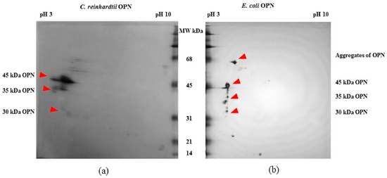 Figure 2. 2D gel electrophoresis of OPN from transgenic (a) C. reinhardtii and (b) E. coli lysates obtained by FLAG-affinity purification.