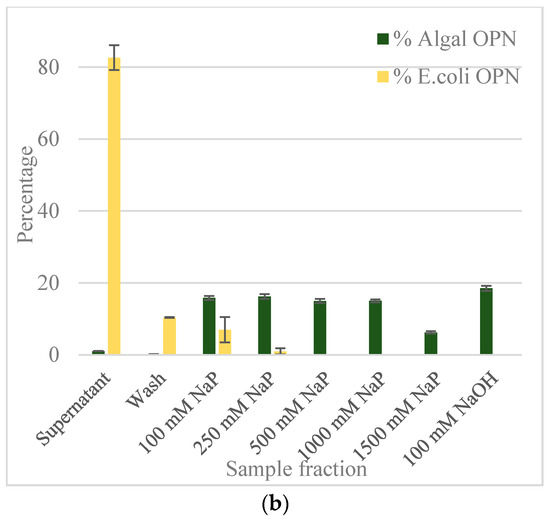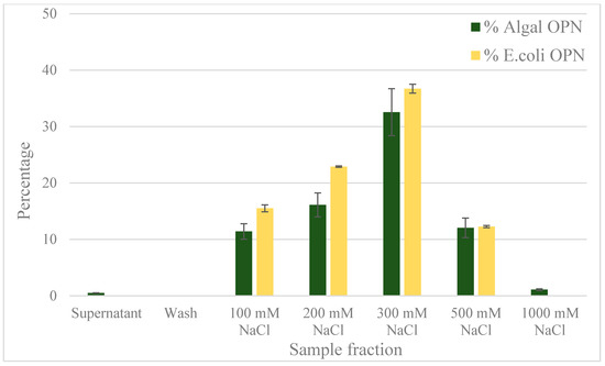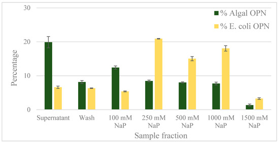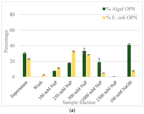 Gallium, iron and zinc immobilized on Chelating Sepharose are known to bind phospho-peptides by coordinate bonds [33,34,35]. Gallium, having higher affinity than other metals for phosphorylated peptides [36], has been selected in this study to determine if differential interactions between Ga3+ and phosphorylated protein residues could be utilized for the separation of C. reinhardtii OPN from non-phosphorylated proteins. As before, E. coli OPN has been used to assess the specificity of OPN–Ga interactions due to phosphorylation. To eliminate any ionic interactions between the protein and Ga-IMAC resin, OPN adsorption and elution was tested in the presence of 150 mM and 500 mM NaCl. Results from Ga-IMAC batch adsorption chromatography are shown in Figure 7. Approximately 20% of C. reinhardtii OPN remained unbound in the supernatant compared to only 7% of E. coli OPN. An additional 8% of algal OPN was removed during the resin wash step. The majority of the unbound and wash fractions contained 35 kDa form of algal OPN (Supplementary data Figure S2) which, as discussed above, did not bind strongly to CHT either. The adsorbed C. reinhardtii OPN started to elute with 100 mM NaP with 8%–12% of 45 kDa OPN continuing to elute in each step elution up to 1000 mM NaP concentration. The major fraction (21%) of bound E. coli OPN was in the second step elution with 250 mM NaP (Figure 7). The remaining bound E. coli OPN was eluted with 500 and 1000 mM NaP.