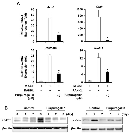 To further confirm that purpurogallin inhibits osteoclast differentiation, we examined mRNA expression levels of osteoclast-specific marker genes, such as tartrate-resistant acid phosphatase (Acp5), cathepsin K (Ctsk), and dendritic cell-specific transmembrane protein (Dcstamp), after purpurogallin treatment. Real-time PCR analysis demonstrated that the expression of osteoclastic marker genes was upregulated by stimulation of RANKL, whereas purpurogallin downregulated the expression of the osteoclast-specific genes (Figure 2A). In addition, to understand the inhibitory mode of action of purpurogallin on osteoclast differentiation, the expression of c-Fos and NFATc1, the key transcription factors, were examined. The results showed that the mRNA level of Nfatc1 and the protein level of NFATc1 and c-Fos were dramatically decreased following purpurogallin treatment (Figure 2A,B).