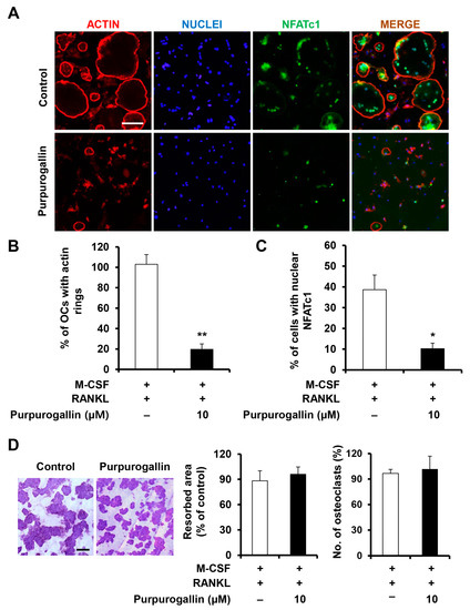 Cell-to-cell fusion to form multinucleated osteoclasts is associated with the formation of actin rings. The actin ring is tightly bound to the bone matrix. Subsequently, the actin ring confines a proton gradient which is necessary to resorb the bone [28]. Purpurogallin treatment significantly inhibited actin ring formation as well as the number of actin rings due to downregulation of osteoclast differentiation (Figure 3A,B). However, it did not inhibit the formation of resorption pits (Figure 3D), suggesting that purpurogallin primarily suppresses osteoclast differentiation, rather than osteoclast activity.