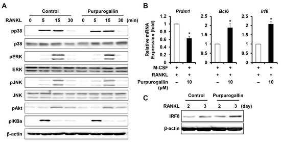 Purpurogallin inhibits the suppression of negative mediators of RANKL-induced osteoclast differentiation. (A) BMMs were incubated in a serum-free medium for 5 h, and subsequently pretreated with purpurogallin (10 μM) or vehicle for 1 h before RANKL (50 ng/mL) stimulation. Phosphorylation of p38, ERK, JNK, Akt, and IκBα was assessed using western blotting; (B) BMMs were incubated in an osteoclastogenic medium with or without purpurogallin for 4 days. The mRNA expression of Prdm1, Bcl6, and Irf8 was analyzed using real-time RT-PCR. * p < 0.05; (C) BMMs were incubated in an osteoclastogenic medium with or without 10 μM purpurogallin for the indicated time period. IRF8 protein expression was analyzed using western blotting.