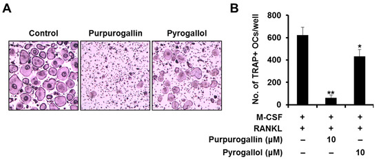 Purpurogallin inhibits osteoclast differentiation more effectively than pyrogallol. (A) BMMs were cultured with M-CSF (10 ng/mL) and RANKL (20 ng/mL) in the presence of purpurogallin or pyrogallol (10 μM). The cells were stained for TRAP; (B) TRAP-positive cells with more than three nuclei were scored. * p < 0.05, ** p < 0.01 versus vehicle-treated control.