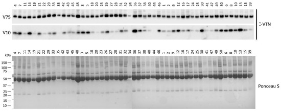 Western blotting analysis of 10 kDa VTN fragment levels in NAFLD patients. Dilutions (1:10) of the serum samples were separated on a non-reducing SDS polyacrylamide gel and probed with an antibody specific for the vitronectin C-terminal end (C-VTN). Total protein staining by Ponceau S on the nitrocellulose membrane is shown. Patient IDs are indicated. These images are representative of experiments carried out in triplicate
