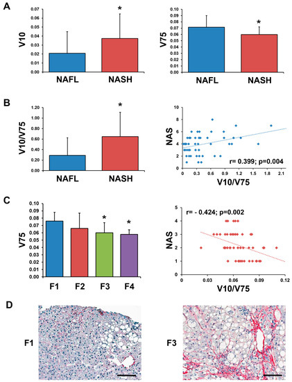 V10 and V75 levels are increased in NASH patients’ serum. (A) Densitometry analysis of the V10 and V75 blots imaged in Figure 2. The total lane density detected from the Ponceau S staining of the transferred protein in the blots was used for normalization. Patients with definite steatohepatitis (NASH group) have higher V10 and lower V75 levels compared with patients without definite steatohepatitis (NAFL group); * = p < 0.05. (B) Histogram showing that the V10/V75 ratio was higher in NASH compared to NAFL group (left); * < 0.05. The scatter plot graph on the right shows the correlation between the V10/V75 ratio and the NAS score. (C) The histogram on the left shows V75 serum levels in patients divided according to the fibrosis (F) score; * < 0.01 versus F1 group. The scatter plot graph on the right shows the correlation between V75 levels and the fibrosis score. (D) Sirius red stains in liver biopsies are representative of F1 and F3 stages, respectively. Scale bar = 100 µm.