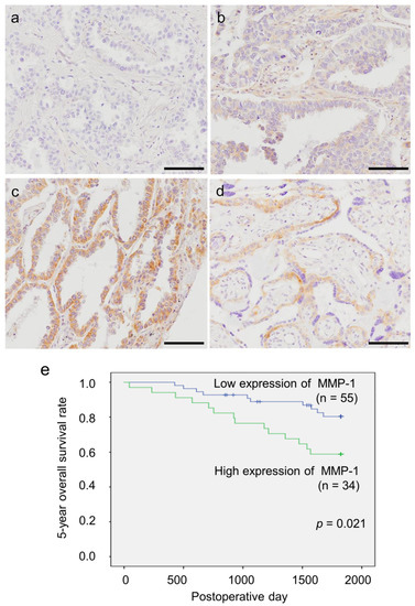 - Li, M.; Xiao, T.; Zhang, Y.; Feng, L.; Lin, D.; Liu, Y.; Mao, Y.; Guo, S.; Han, N.; Di, X.; et al. Prognostic significance of matrix metalloproteinase-1 levels in peripheral plasma and tumour tissues of lung cancer patients. Lung Cancer 2010, 69, 341–347. [Google Scholar] [CrossRef] [PubMed]