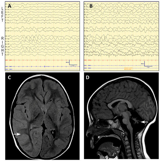 Patient 1: EEG and MRI. EEG shows asymmetric (right) slow background trace with moderately low voltage in temporal regions (A,B), and frontal intermittent rhythmic delta activity (FIRDA) in the right hemisphere, coherent with the edema found on the MRI and the left hemiparesis. Below, axial fluid attenuation inversion recovery (FLAIR) MR image reveals cortical diffuse edema in the right hemisphere, mainly in the parieto-occipital region (C, see arrow). Midsagittal T1-weighted MR image of the same patient shows a small cerebellar vermis with enlarged interfolial spaces representing atrophy and secondary enlargement of the fourth ventricle (D, see arrow).