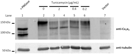 Hypoglycosylation levels of the CaV regulatory α2δ subunits under different concentrations of tumicamycin. Immunoblot analysis of glycosylated fragments of α2δ subunits heterologously expressed in HEK293 cells (along with the α1A CaV2.1 pore-forming channel subunit and β3 regulatory subunit), treated or not with increasing concentrations of tunicamycin (0.2, 0.6 and 2 μg/mL, as indicated). The extent of α2δ glycosylation was identified by using antibody anti-α2 (1:500 dilution, Sigma D219, St. Louis, MO, USA) (top panels) and is shown as the difference in molecular weight between the glycosylated and unglycosylated forms. Molecular weight markers are indicated on the left. PNGase F was also added to protein extraction from tunicamycin-untreated cells in order to identify unglycosylated forms in vitro. Upper bands potentially corresponding to glycosylated α2δ progressively decrease as the concentration of tunicamycin increases, which in turn promotes the appearance of a lower band potentially corresponding to unglycosylated α2δ (lanes 2 to 6). In vitro PNGase F treatment (lane 1) shows two main bands potentially corresponding to unglycosylated α2δ (upper band) and unglycosylated α2 (lower band), as previously reported [26].Protein extraction from HEK293 cells transfected only with the vector plasmid was included as negative control (lane 7). For each experimental condition, the protein sample was probed with anti-tubulin (1:2000 dilution, Sigma T6074) (bottom panel) as loading control.