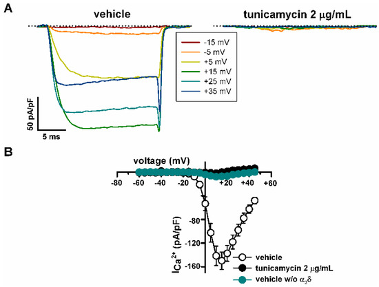 Thus, 2 μg/mL tunicamycin almost abolished CaV2.1 Ca2+ currents (Figure 3A right panel, and B) compared to cells treated with the vehicle (DMSO) (Figure 3A left panel, and B). Such tunicamycin effect was mimicked by removal of the regulatory α2δ1 subunit (Figure 3B). Under these experimental conditions, maximal Ca2+ current density was reduced from −149.8 ± 14.9 pA/pF (n = 27) to −1.9 ± 1.8 pA/pF by tunicamycin (n = 6) (p < 0.001) and to −7.8 ± 2.9 pA/pF in the absence of the α2δ1 subunit (n = 7) (p < 0.001) (Kruskal-Wallis test followed by Dunn post hoc test) (Figure 3B).