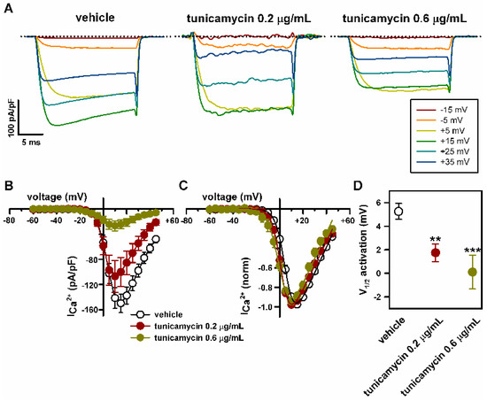 At lower concentrations, a smaller decrease of α2δ1 glycosylation by tunicamycin was found (Figure 2) and the effect on the amplitude of CaV2.1 Ca2+ currents was less important, with reductions in peak current density to −107.03 ± 25.1 pA/pF (n = 13) (p > 0.05) and to −26.7 ± 7.9 pA/pF (n = 16) (p < 0.001) induced by 0.2 and 0.6 μg/mL tunicamycin, respectively (Kruskal-Wallis test followed by Dunn post hoc test) (Figure 4A,B). The CaV2.1 voltage-dependent activation curve was left-shifted and the potential for half-maximal channel activation (V1/2 activation, directly related to the energy necessary to open the channel) was significantly decreased in response to both 0.2 and 0.6 μg/mL tunicamycin treatments (by ~3.5 mV and ~5 mV, respectively) (Figure 4C,D). Consistently, the maximum current amplitude was elicited by depolarizing pulses to +15 mV or +10 mV for control (vehicle) or tunicamycin treatments, respectively (Figure 4B,C).