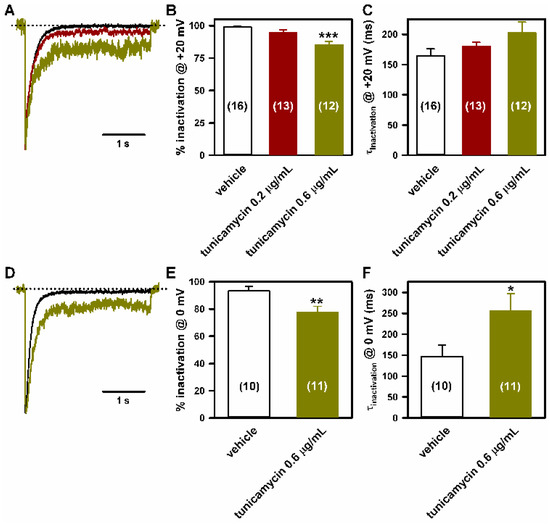 Tunicamycin (0.6 μg/mL) also impaired the inactivation of CaV2.1 Ca2+ currents: compared to the control (vehicle) condition, the degree of inactivation at the end of 3s depolarizing pulses to +20 (Figure 5A,B) or 0 mV (Figure 5D,E) was lower (by ~14% and ~16%, respectively); and there was a tendency for slow CaV2.1 inactivation, which reached statistical significance for Ca2+ currents elicited by depolarization to 0 mV (Figure 5A,C,D,F).