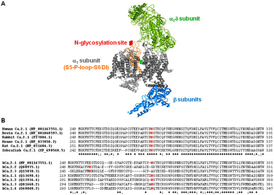 Location and conservation of the N283 amino acid residue. (A) Illustration showing the location of the potential glycosylation site at residue N283 (in red) at the extracellular P-loop between S5 and S6 transmembrane segments in domain I of the pore forming α1A subunit (in orange). The structure of the CaV1.1 complex, containing α1 (in grey), β (in blue) and α2δ (in green) subunits, was used as model (PDB 5GJV). (B) Sequence alignment of P-loop regions at domain I (DI) of CaV2.1 channel α1A subunits from different organisms (as indicated) (top), and sequence alignment of P-loop-DI α1 regions of human high-voltage activated Ca2+ channels belonging to the CaV2.x and CaV1.x families (bottom). Alignments were performed with Clustal Omega (www.ebi.ac.uk/Tools/msa/clustalo/, access on 30 November 2017). Potential sites for N-glycosylation (including N283 at the human CaV2.1 channel) are shown in red. Asterisk means identical residues; colon and period indicates the existence of conservative and semi-conservative amino acid substitutions, respectively.