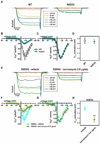 Hence, we compared the biophysical properties of CaV2.1 channels composed by wild-type (WT) or N283Q glycosylation mutant α1A, β3 and α2δ1 subunits, heterologously expressed in HEK293 cells. Peak Ca2+ current density for N283Q mutant CaV2.1 channels were ~72% lower than for WT channels (Figure 7A,B). N283Q did not alter CaV2.1 voltage-dependent activation (Figure 7C,D). Interestingly, tunicamycin (0.6 μg/mL) shifted V1/2 activation for N283Q CaV2.1 channels to less depolarized potentials (by ~4.5 mV) (Figure 7E–H), in line with its gain-of-function effect on WT CaV2.1 activation (Figure 4A–D).