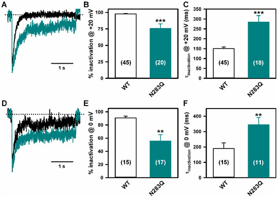 Finally, Ca2+ currents through N283Q mutant CaV2.1 channels in response to 3 s depolarizing pulses to either +20 mV (Figure 8A–C) or 0 mV (Figure 8D–F), showed lower (~22% and ~35%, respectively) and slower inactivation than currents through WT channels.