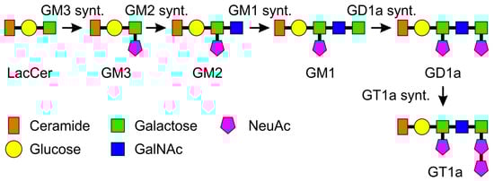 Glycosphingolipids (GSLs) are important glycan structures mainly residing at the cell surface, especially in neuronal cells. GSLs comprise ceramide linked to a varying number of sugar residues. Gangliosides are a subgroup of GSLs, distinguished by the presence of sialic acid residues, mainly N-acetylneuraminic acid in humans [,]. The biosynthesis pathway and the structures of the a-series gangliosides with their synthesizing enzymes are shown in Figure 1, and the genes and the respective enzymes are summarized in Table 1. GM3 is synthesized from lactosylceramide (LacCer) by the enzyme LacCer sialyltransferase (GM3 synthase) and is the precursor for the a-series gangliosides. Conversion to GM2 takes place by the action of GM2 synthase (GalNAc transferase). Addition of a galactose residue to GM2 by galactosyltransferase 2 (GM1 synthase) results in GM1a ganglioside, which can further be converted into GD1a upon terminal sialylation by a sialyltransferase (GD1a synthase). GT1a can be synthesized from GD1a by sialylation by GT1a synthase. The same enzymes are responsible for the synthesis of the b- and c-series gangliosides where the synthesis precursors arise from GM3 by further sialylation. For a detailed description of the structures of the b- and c-series, please refer to the review by Daniotti and Iglesias-Bartolomé []. Ganglioside synthesis takes place mainly in the Golgi where glycosyltransferases sequentially add sugar residues to the lipids. Glycosyltransferase expression is regulated especially at the transcriptional level, but also by formation of protein complexes comprising several glycosyltransferases [,].