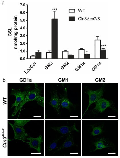 Intracellular accumulation of gangliosides is associated with several lysosomal storage disorders. In this study, we have quantitatively analyzed the a-series gangliosides in the mouse cerebellar granule neuronal precursor cell lines generated from wildtype (WT) and homozygous Cln3Δex7/8 mice []. Lipids were extracted from cultured cells and analyzed by high performance liquid chromatography (HPLC, Figure 2a). Our data revealed a highly significant increase in the ganglioside GM3 in Cln3Δex7/8 cells (p < 0.001). Furthermore, GM1a and GD1a gangliosides were significantly decreased in Cln3Δex7/8 cells (p < 0.05 and p < 0.001, respectively), as compared with WT cells. A tendency for increased LacCer (p = 0.126) and decreased GM2 (p = 0.075) was also observed, but these data were not significant. We were unable to detect the b-series gangliosides, including GD3, by HPLC analysis, indicating that the levels of these gangliosides are extremely low in these cells. In agreement with the HPLC data, immunofluorescence staining of Cln3Δex7/8 cells showed a reduced amount of GD1a and GM1a, whereas GM2 was not considerably altered (Figure 2b). Unfortunately, specific, validated antibodies for GM3 are not commercially available that would allow its detection by immunofluorescence.