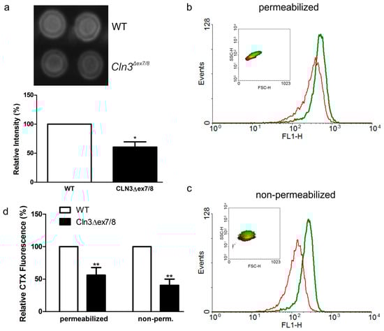 GM1a ganglioside also functions as a high-affinity receptor for the cholera toxin B subunit (CTX). Thus, CTX binding to Cln3Δex7/8 cells was used to quantitatively assess GM1a levels. Dot blot analysis with horseradish peroxidase (HRP) coupled CTX (Figure 3a) revealed a significantly reduced CTX binding to Cln3Δex7/8 cell lysates. To study if the reduction of GM1a fraction was global or restricted to the plasma membrane or intracellular compartments, flow cytometry analysis of bound CTX-FITC was performed in digitonin-permeabilized (Figure 3b, plasma membrane and intracellular pools) and non-permeabilized cells (Figure 3c, plasma membrane pool). A significantly reduced CTX-FITC binding was detected in both permeabilized and non-permeabilized Cln3Δex7/8 cells (Figure 3d), but the degree of reduction in non-permeabilized cells was slightly higher than in permeabilized cells.