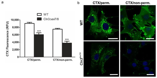 To verify the flow cytometry data, the binding of CTX-FITC to permeabilized or non-permeabilized WT and Cln3Δex7/8 cells was quantified using a fluorescence plate reader (Figure 4a). A significant difference in CTX intensity between WT and Cln3Δex7/8 cells was measured both with and without permeabilization. Again, the degree of reduction in CTX-FITC staining was higher in non-permeabilized Cln3Δex7/8 cells. These data imply that not only the amount but also the relative distribution of GM1a might be altered in Cln3Δex7/8 cells. Fluorescent staining of the cells with CTX-A488 (Figure 4b) also showed a clear reduction of CTX staining in both permeabilized and non-permeabilized Cln3Δex7/8 cells. Taken together, the above data demonstrate that GM1a ganglioside amount and cellular distribution may be altered in Cln3Δex7/8 cells.