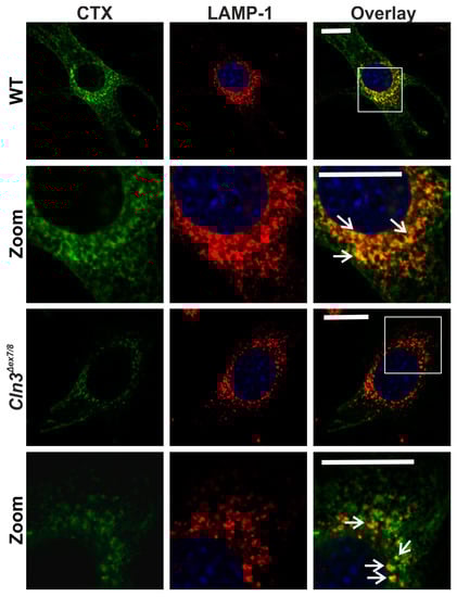 Since JNCL is a lysosomal storage disorder with alterations in endosomal/lysosomal system, the localization of the intracellular CTX in lysosomes was studied using staining with anti-LAMP-1 antibodies in CTX-A488 labeled WT and Cln3Δex7/8 cells (Figure 5). In both cell lines, the CTX staining was partially colocalized with the LAMP-1 staining, indicating that although the Cln3Δex7/8 cells exhibit less CTX staining, the intracellular portion was still mainly localized in the late endosomal/lysosomal compartments.