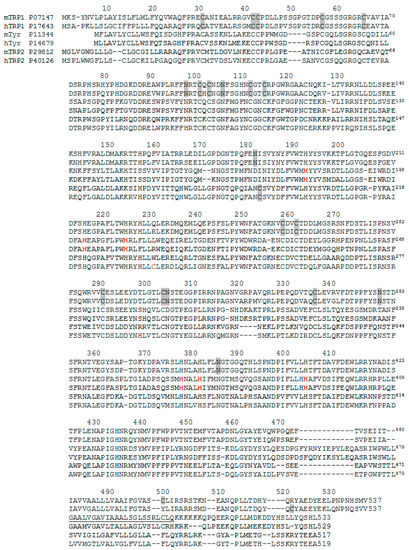 Sequence alignment of mouse (m) and human (h) Trp1 (first two lines), tyrosinase (third and fourth) and Trp2 (fifth and sixth). Alignment was performed with Expasy facilities. References of the six proteins are indicated in the initial line for each one taken from the UniProtKB database (Available online: www.expasy.org, [69]). Important Cys and Asn residues are indicated on Trp1 sequences (grey residues). Conserved His at the MeA and MeB binding sites are marked in bold on the tyrosinase sequence (central lines). The transmembrane fragment is underlined in mouse tyrosinase. For other details and relevant residues, see the text.