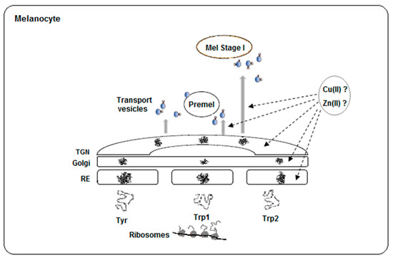 Scheme of the traffic and maturation of the tyrosinase family. Nascent polypeptides coming from polyribosomes pass through endoplasmic reticulum (ER), Golgi and TGN (trans-Golgi network) for proper folding. Then, N-glycosylated proteins are transported to premelanosomes or melanosomes in vesicles by recognition of specific adaptor proteins to motifs at the respective C-carboxy tails. Truncation of the C-terminal may alter the pathway of the proteins. On the other hand, the location for Zn(II) or Cu(II) acquisition by apo-proteins is unknown, but different traffic might imply different metal incorporation. Experimental data indicate that the metal binding site in the tyrosinase family seems to accommodate both ions.