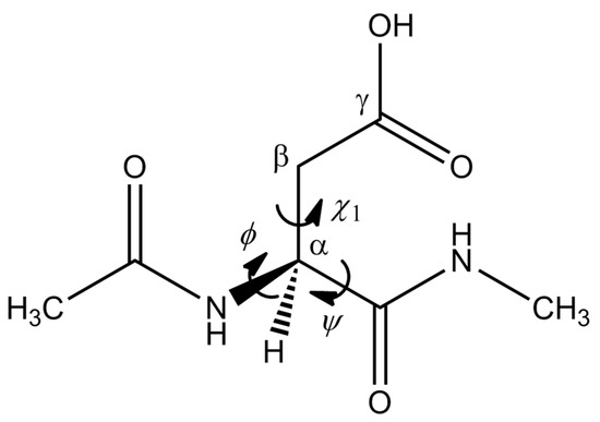 The model compound used in the present study (Ac–l-Asp–NHMe, Ac = acetyl, Asp = aspartyl, and NHMe = methylamino). The φ (C–N–Cα–C) and ψ (N–Cα–C–N) dihedral angles that characterize the main-chain conformation, and the χ1 dihedral angle (N–Cα–Cβ–Cγ) that characterizes the side-chain conformation are indicated.