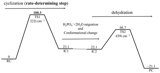 Energy profile for the two-step succinimide formation catalyzed by the H2PO4− ion. RC: reactant complex; TS: transition state; IC: intermediate complex; PC: product complex. The relative energies after the zero-point energy (ZPE), thermodynamic (25 °C), and hydration Gibbs energy corrections are shown in kJ mol−1 with respect to the RC. Also shown are the imaginary frequencies of the two transition states.
