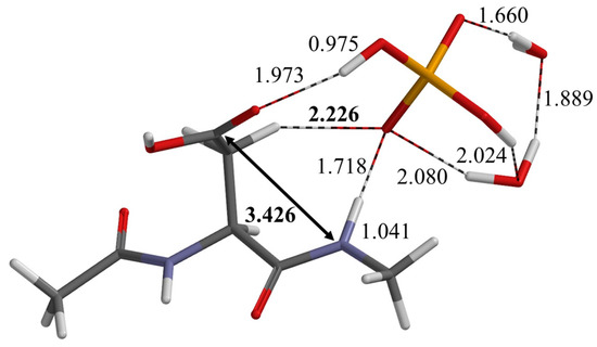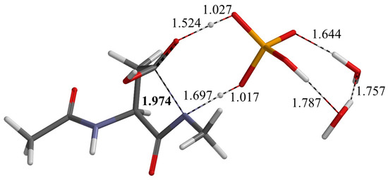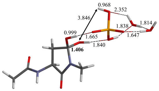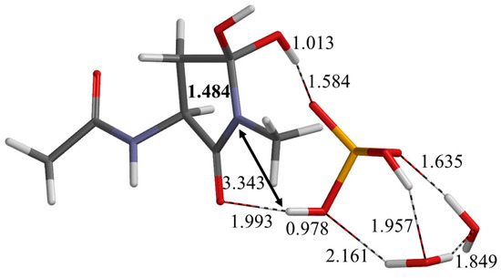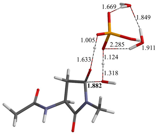 The geometry of the reactant complex (RC). This complex is formed between the model compound (Figure 1), a H2PO4− ion, and two water molecules. Selected interatomic distances are shown in Å. Grey: carbon; white: hydrogen; blue: nitrogen; red: oxygen; orange: phosphorus.