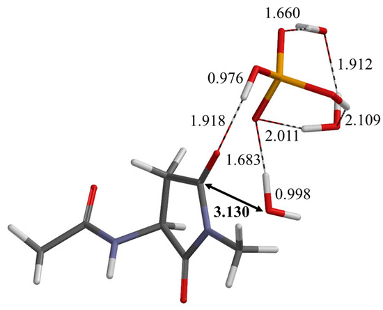 Figure 8 shows the resultant product complex (PC), which comprises the succinimide product, a H2PO4− ion, and three H2O molecules. Note that three H2O molecules exist in the PC, since a H2O molecule has been released. The distance of the broken C–O bond is 3.130 Å (as indicated by boldface in Figure 8). The energy of the PC is lower than that of the RC by about 21 kJ mol−1. This may seem to contradict succinimide’s role as an intermediate in the overall reaction scheme, as shown in Scheme 1. However, this is not so. It should be noted that, in the present case, we should use the biochemical conventions for the standard states of water and proton (instead of the physical chemical conventions), because the reactions are postulated to occur in aqueous media near neutral pH [28,34]. For water, the biochemical standard state corresponds to the concentration of 55.5 M. For a reaction that releases a water molecule (such as the reaction studied here), the biochemical standard Gibbs energy of reaction is higher by about 10 kJ mol−1 (at 25 °C) than when the physical chemical standard state is used [28]. Therefore, the standard Gibbs energy of reaction is roughly estimated to be about −11 kJ mol−1 for the present reaction. This value is consistent with the standard enthalpies and entropies of reaction reported for the Suc formation from two small peptides, Ac–l-Asp–Gly–NHMe and Ac–Gly–l-Asp–Gly–Gly–NHMe [22], from which the standard Gibbs energies of reaction at 25 °C are calculated to be about −5 kJ mol−1 (for the protonated form, see below).