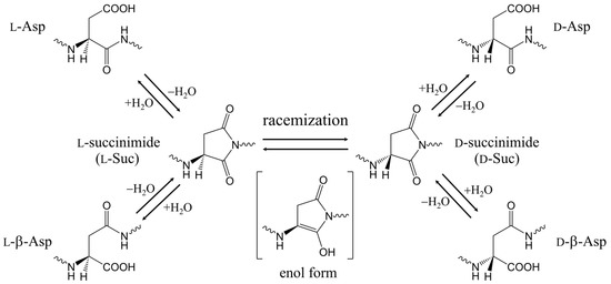 Most of the amino acid residues that are prone to racemization are aspartic acid (Asp) residues. This is because the racemization occurs easily via the five-membered ring succinimide intermediate (aminosuccinyl residue, Suc) (Scheme 1) [17,18,19]. In this mechanism, the actual species undergoing racemization is Suc, and due to the difference in the position of the ring-opening, a total of four isomers can be produced, i.e., l-Asp and l-β-Asp from l-Suc, and d-Asp and d-β-Asp from d-Suc. For peptides, a typical ratio of l-Asp and l-β-Asp (or d-Asp and d-β-Asp) residues is 1:3 [17,18,20,21,22]. Therefore, the susceptibility to the Suc formation is reflected by the isomerized and/or racemized Asp residues.