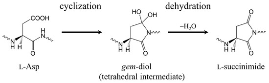 The Suc residue is formed by the nucleophilic attack of the main chain nitrogen of the C-terminal adjacent residue on the Asp carboxyl carbon, with the release of a water molecule. This is an intramolecular nucleophilic substitution reaction, and is basically regarded to proceed in two steps (cyclization–dehydration, Scheme 2) [22,23].