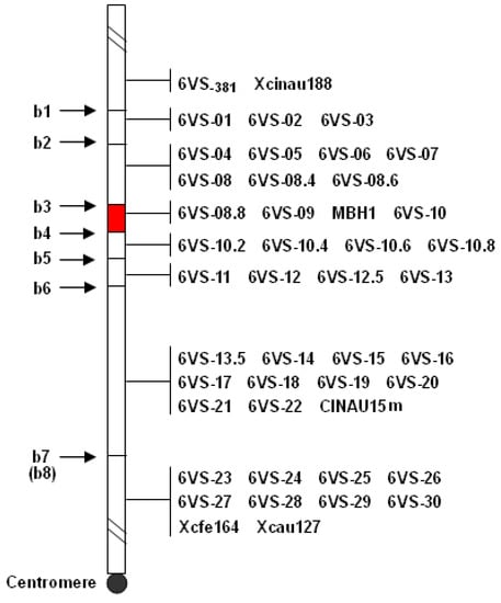 In the present study, a total of 45 gene-derived 6VS markers were used to map Pm21. Among them, 42 markers were reported previously, including 6VS-01–6VS-30 [], 6VS-381 [], MBH1 [], Xcinau188, Xcfe164 [], Xcau127 [], CINAU15m, 6VS-08.4, 6VS-08.8, 6VS-10.2, 6VS-10.4, 6VS-10.6, and 6VS-10.8 []. The other three markers—6VS-08.6, 6VS-12.5, and 6VS-13.5—were newly developed in this study.