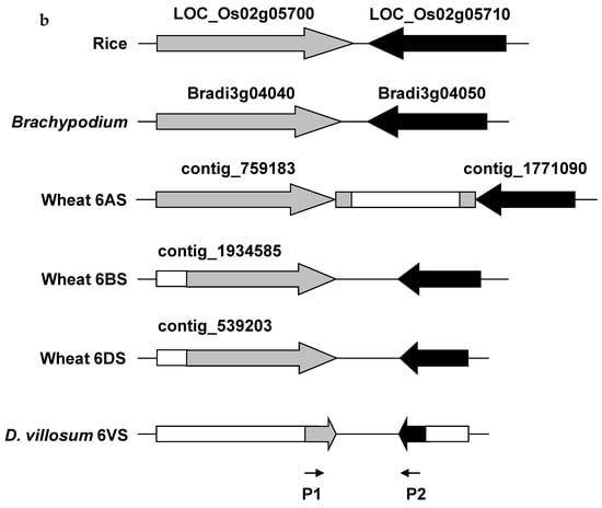 Unexpectedly, all the polymorphic bands of the markers 6VS-10.2, VS-10.4, 6VS-10.6, and 6VS-10.8 were absent in del.6VS-1 (Figure 3a), which implied that there was an additional deletion in del.6VS-1. Comparative analysis showed that the corresponding genes of the markers 6VS-10.8 and 6VS-11 were all linked on the short arms of chromosome 2 (2OsS) in rice and chromosome 3 (3BdS) in Brachypodium, and on wheat 6BS and 6DS, except a disruption caused by retrotransposon-like repeat sequence on wheat 6AS. To detect the linkage relationship of the two genes in D. villosum, a pair of primers, P1/P2, was designed according to the conserved sequences between wheat and Brachypodium, and used to amplify the potential fragment. Sequencing analysis showed that the ends of PCR products matched with the corresponding genes of 6VS-10.8 and 6VS-11, respectively (Figure 3b), demonstrating that the corresponding genes of the two markers are also physically linked in D. villosum. Taken together, a new interstitial deletion on 6VS was confirmed in del.6VS-1, and the corresponding breakpoints were then designated as b6 (close to b5) and b7.