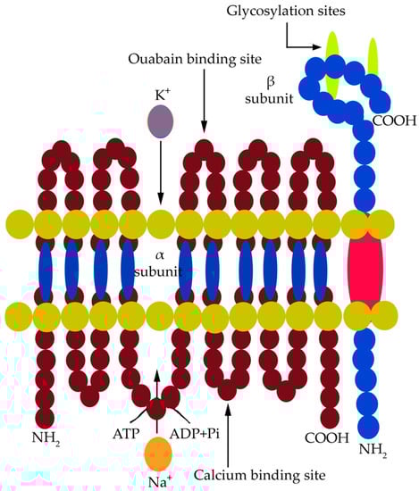 Na+, K+-ATPase in animals is sensitive to the glycoside ouabain. This electrogenic P-type membrane pump carries out a coupled transport of three Na+ ions outside the cell and two K+ ions inside the cell. It is a transmembrane heterodimeric protein comprised of α and β subunits, forming intracellular and extracellular domains and five pairs of transmembrane helices [95]. The α and β subunits have four isoforms each, expressed in a tissue- and cell-specific manner, and they vary in their sensitivity towards Na+ and the steroid glycoside ouabain (inhibitor of Na+, K+-ATPase in animals). The pump carries out a coupled ion transport accomplished by the hydrolysis of ATP and a subsequent phosphorylation event. It requires Mg2+-ATP as its major substrate and has affinity towards specific ligands [143]. The α subunit is 110 kDa in size and comprises about 1000 amino acid residues. The four isomers of the α subunit, namely, α1, α2, α3, and α4 differ in their functional properties. The α1 subunit is a housekeeping isoform expressed in most animal tissues [143]. A saline environment triggers the quantitative expression of specific isoforms depending upon their Na+-binding affinity. The α subunit consists of five pairs of transmembrane helices forming the cation transport path and of three cytoplasmic domains which contain the binding sites for Mg2+-ATP and Na+ (Figure 2).