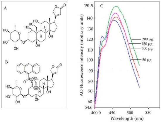 (A) Chemical structure of ouabain and (B) its fluorescent derivative 9-anthroylouabain. (C) Dose-dependency (protein concentration ranging from 50 to 200 µg) of fluorescence intensity obtained from the fluorescence emission spectra due to OU-sensitive ATPase binding to 9-anthroylouabain (ex. 365 nm, em. 460 nm) [85].