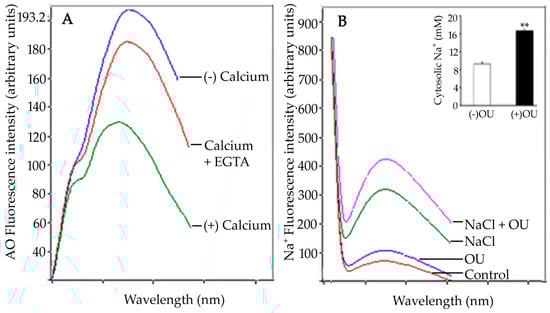 The observed fluorescence intensity at 460 nm is a function of putative OU-sensitive ATPase activity. Enhanced fluorescence results from the binding of the enzyme to 9-anthroylouabain in a dose-dependent manner. This OU-sensitive sodium efflux system is induced in seedling roots salt stress. Confocal laser scanning microscopic (CLSM) imaging of salt-stressed seedling root tips showed significantly enhanced fluorescence due to OU-sensitive ATPase activity (as compared to control). The activity was prevalent in cells of columella, epidermis, sub-epidermis, and in meristematic cells [85]. The report suggested an inverse relation between cytosolic Na+ concentration and OU-sensitive ATPase activity (Figure 4).
