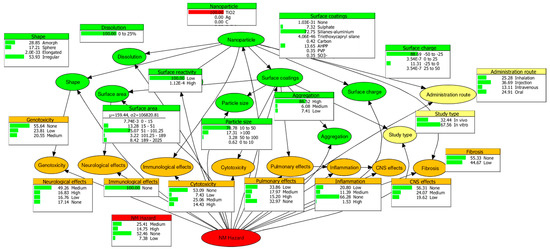 Graphical structure and parameterization of the Bayesian networks (BN) with TiO2 as the sample nanomaterial (NM). Ellipses represent nodes and directed links signify the conditional relationship between parent and child nodes. The accompanying bar charts denote the % state probabilities. The nodes are colour categorised into green for physicochemical properties, yellow for experimental methodology, orange for biological effects, and red for NM hazard potential. Adapted from Marvin et al. [9].