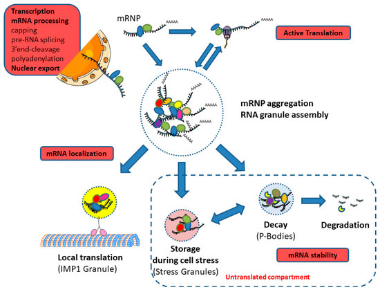Some RBPs play important roles in coordination and/or regulation between the different steps of the whole mRNA life-cycle. This occurs when coupling in time and space or a link between different molecular processes is required [30,31]. The mRNP protein content determines each mRNA fate in a spatiotemporal way. They are either immediately translated or transported into localized storage or translation areas (Figure 3) [32]. This explains why complexes between RNAs and RBPs are big and highly dynamic structures undergoing constant remodeling. This remodeling results from the versatility of competitive interactions of RBPs and other proteins into RNP complexes and RBPs being regulated by various post-translational modifications (PTMs), such as isomerization, methylation, acetylation, phosphorylation, O-GlcNAcylation (O-Linked β-N-acetylglucosamine modification), and ubiquitination [33,34].