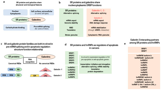 In 2010, Haudek et al. highlighted some intriguing structural and biological features shared by galectins and SR proteins (Figure 4a) [118]. They exhibit an expression in several subcellular compartments, are able to bind sugars, and are involved in mRNA alternative splicing (Figure 4b,c). In SR proteins, the canonical RRM domain is considered responsible for RNA-recognition specificity in mRNA alternative splicing, but in galectin-1 and galectin-3 no RBDs are characterized (Figure 4c, Figure 5a,b). It has been shown that, in SR proteins, a second typical domain of this family, called the RS domain, exhibits similar properties to IDPs. This domain is able to interact with other splicing enhancer factors than those binding to RRM and promotes pre-spliceosome assembly formation [27]. In galectin-3, besides the carbohydrate domain (CRD) considered responsible for the major functions of this galectin, a long N-terminal LC sequence is found which interacts with the CRD [119]. Experiments performed in our laboratory showed that, despite the absence of a canonical RBD, galectin-3 is a new non-classic RBP able to stabilize mRNAs without direct interaction with an RNA target. It does this, instead, through an hnRNP-L interaction. Moreover, this work demonstrates that galectin-3 is involved in RNA nuclear export and storage in cytoplasmic granules of MUC4 mRNA [120]. Many questions arise now on a possible common role played by SR proteins, hnRNPs, and galectin-3 in the deregulation of apoptotic genes in cancers. A recent review highlights the complex and dual role of SR proteins and hnRNPs, not only on alternative splicing but also on mRNA stability, translation, and protein degradation of 34 genes involved in apoptosis regulation (Figure 4d) [64]. On the other hand, works by Fritsch et al. identified protein partners of galectin-3 in the nucleus. In this report, 14 galectin-3 binding-partners were hnRNPs and two were SR proteins (Figure 4e) [121]. Together, this data expands the relevance of a network of RBPs involved in apoptosis regulation.