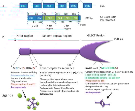 Galectin-3 is an example of a non-classic DNA-binding and RNA-binding protein (DRBP) harboring a large IDR. (a) The LGALS3 gene maps to 14q21-2. Six exons are found in full-length cDNA. In the bottom schema, protein coding sequences are highlighted in green, whereas untranslated exons are depicted in blue. Three alternative spliced variants encode three proteins which are 250 (full-length, shown in b), 223, and 88 amino acids (aa) (not shown), respectively. Four alternative spliced transcripts (not shown) are non-coding RNAs. (b) Functional domains of human galectin-3 (comprised of 250 aa). Galectin-3 is composed of three major domains [127,128]. Two of these domains—the short 12 aa N-terminal region and the 130 aa globular C-terminal domain (118–248 aa) containing the CRD with the carbohydrate binding site (181–187 aa) [119,127] are involved in apoptosis regulation. Galectins are a large family of proteins with a galactose-lectin region (GLECT) containing a common CRD able to bind many glycoprotein and glycolipid targets with β-galactoside motifs. They regulate cell death both intracellularly and extracellularly and have other relatively broad functions. Galectin-3 is the only galectin with both anti-apoptotic and pro-apoptotic activities, according to cell types. This is also the only galectin to harbor a long IDR in its structure, between the N- terminal and C-terminal domains [129]. The galectin-3 IDR is a LC sequence harboring a stretch of repetitions of three aa (proline, glycine, and tyrosine) with a 9 aa collagen-like consensus sequence: Y-P-G-(X)3-P-G-A. This domain (with approximately from 20 to 100 amino acids) interacts with itself and with a part of the CRD not involved in carbohydrate recognition (approximately 200–220 amino acids), forming a fuzzy complex via intermolecular and intramolecular interactions, mainly through hydrophobicity [119]. A new carbohydrate binding site was recently identified in the LC [130]. Like many RBPs, galectin-3 harbors phosphorylable serines (three serines highlighted in red) and is able to constitute multimers (pentamers). The β-galactoside binding motif is in green. Galectin-3 is involved in the mRNA life-cycle through different ways: through binding with the ribonucleoprotein U1 of the spliceosome [131,132], through stabilizing mRNA (through hnRNP-L interaction), and through mRNA nuclear export and storage in cytoplasmic granules [120]. Galectin-3 also acts as a player in the DNA damage response through its interaction with BARD1 in a large complex involving a BRCA1/BARD1 heterodimer [126]. Galectin-3 interacts in an O-GlcNAcylation-dependent manner with a key mitotic regulator, the nuclear mitotic apparatus protein (NuMA), which is required for the establishment and the cohesion of the mitotic spindle [125]. The subdomains or motifs involved in DRBP functions which are newly attributed to galectin-3 have not been identified yet.