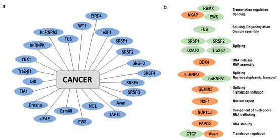 The continuity all along mRNA life-cycle is ensured by the RBPs which provide a quick and appropriate cell response to stimuli. The major regulatory role of RBPs, and in particular of these new unconventional RBPs, raises the question of their involvement in the development of pathological processes such as carcinogenesis (Figure 6a,b).