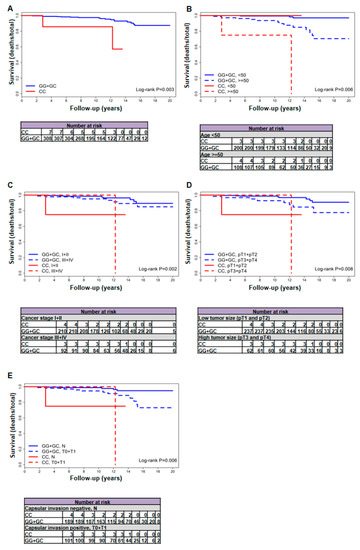 Interaction between rs2910164 and clinical factors in shaping the overall mortality Kaplan–Meier survival curves of the interaction of rs2910164 variant with the overall survival (A) and the clinicopathological risk factors: age at diagnosis (B), clinical cancer stage (C), tumor size (D) or capsular invasion (E) in patients with follicular variant of papillary thyroid carcinoma. In all panels, follow-up time is truncated at 20 years. In each panel, p values are from the log-rank test.